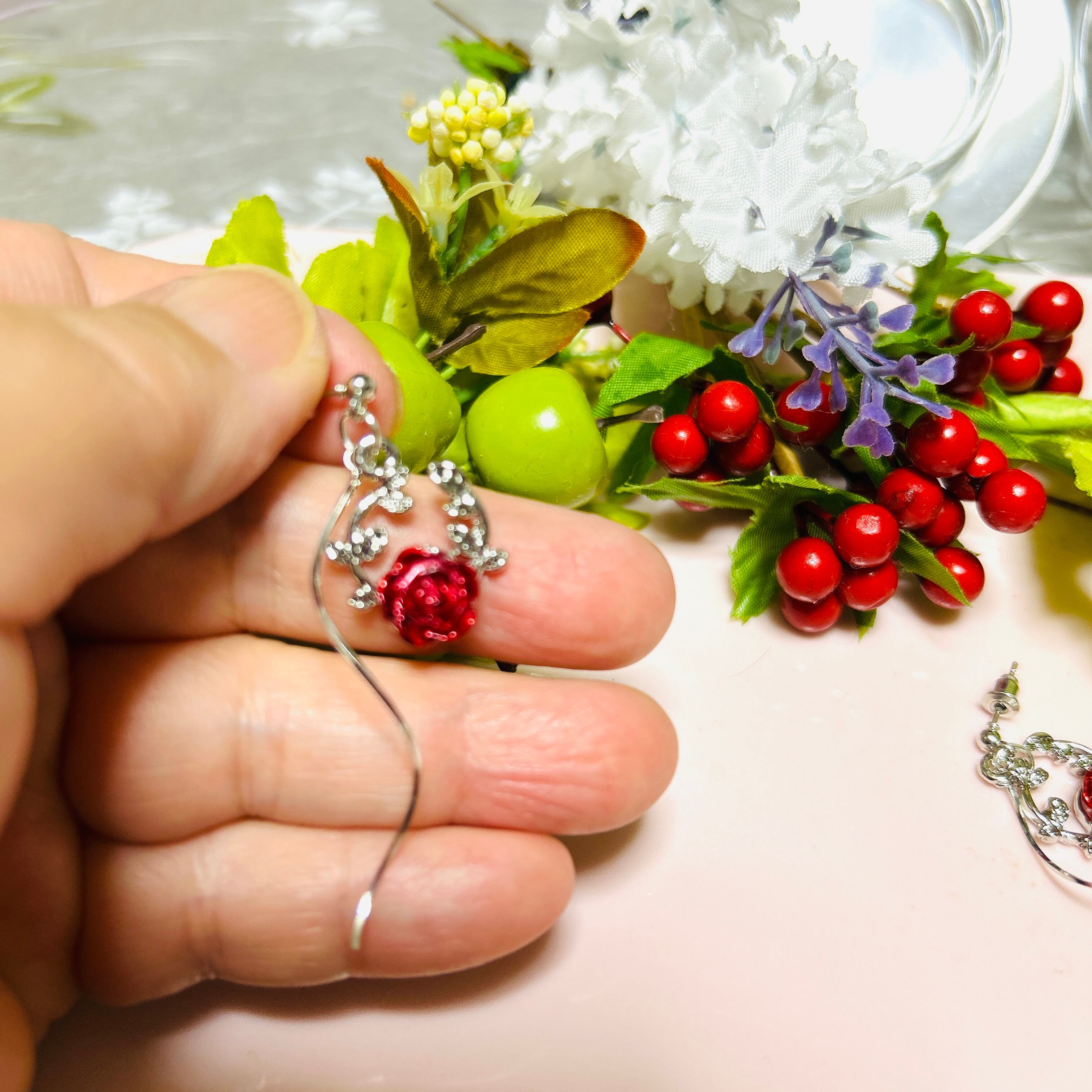 赤色のバラパーツとクネクネしたS字スティックピアスを使用した魅力的なアイテムが新登場しました!鮮やかな赤いバラが華やかな印象を与え、S字のデザインが耳元で優美に揺れます。このピアスは、シンプルでありながらも独特の個性が光るデザインが特長で、日常のコーディネートから特別なシーンまで幅広くお楽しみいただける素敵なアクセサリーとして自分自身のスタイルを引き立てます。