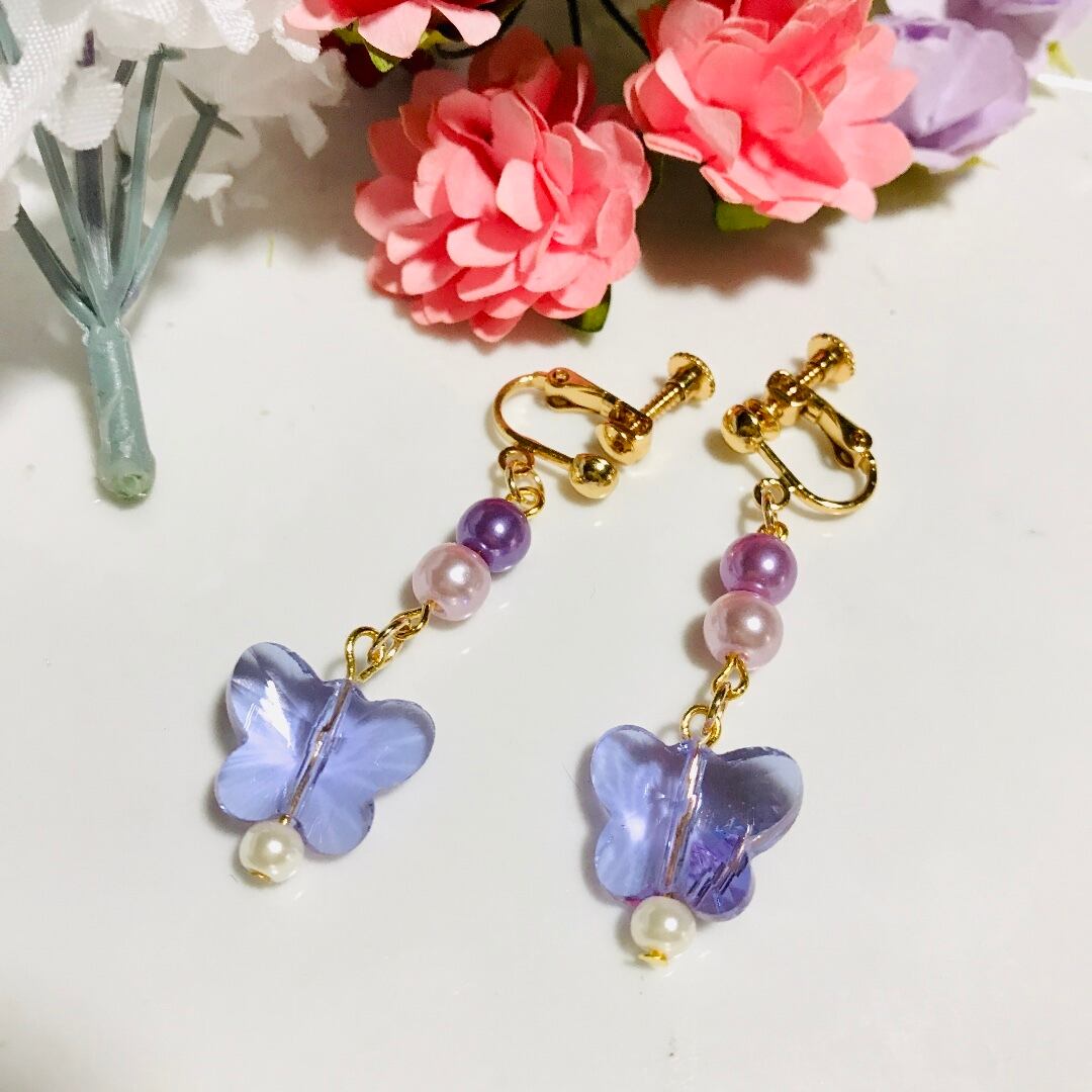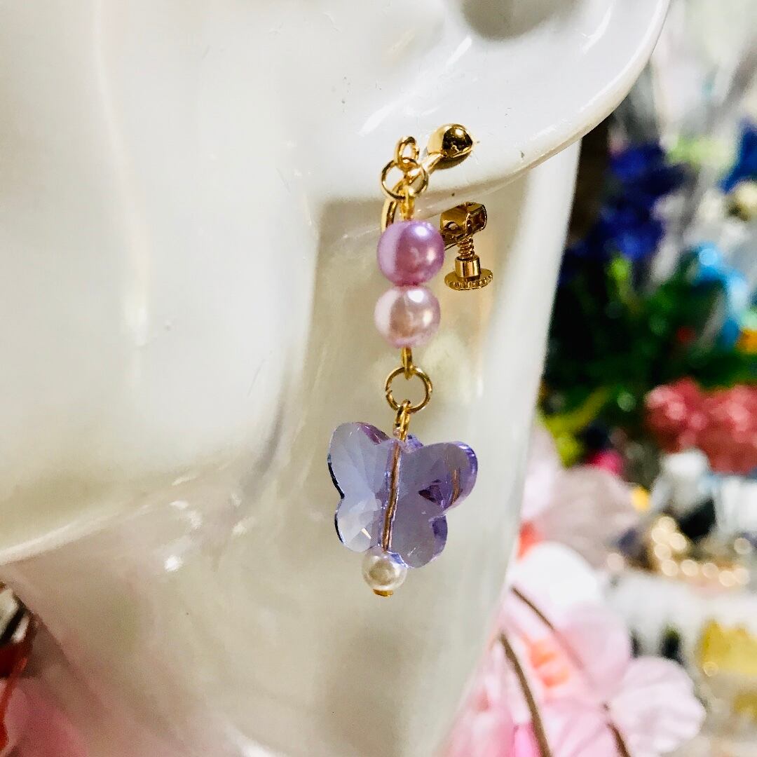 ☆パープルクリスタルバタフライ☆パールビーズイヤリング☆ピアス