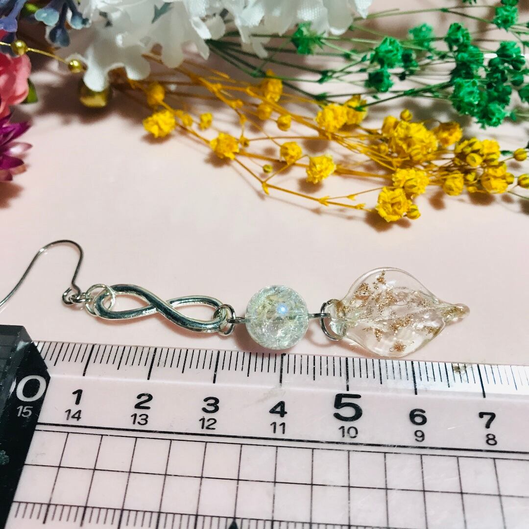 ☆天然石クラック水晶♪無限大インフィニティチャーム☆ガラスリーフピアス☆