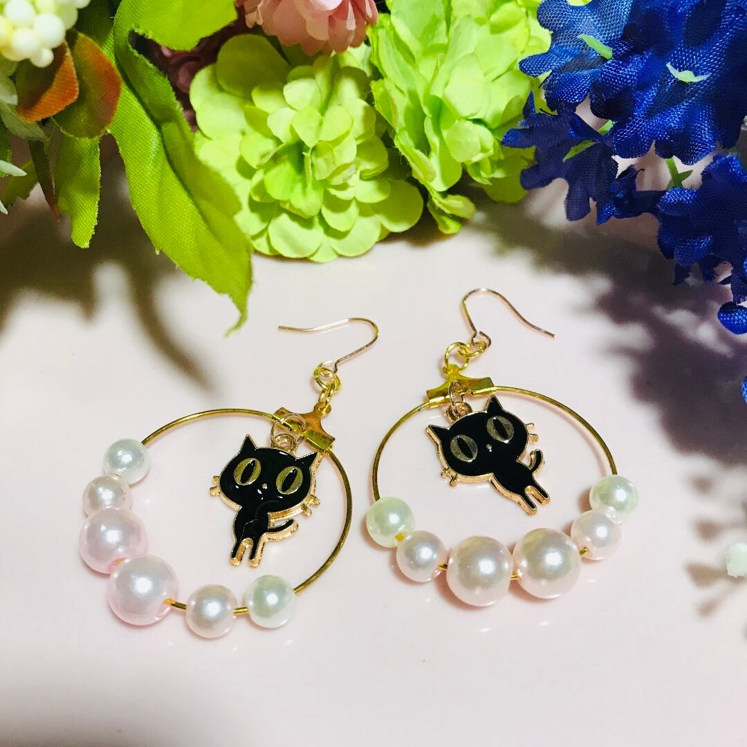 ☆ニャンコチャーム☆パールビーズフープピアス♪