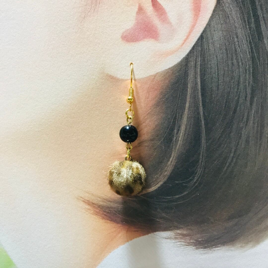 ☆レオパード柄ボンボン☆天然石オニキスピアス☆