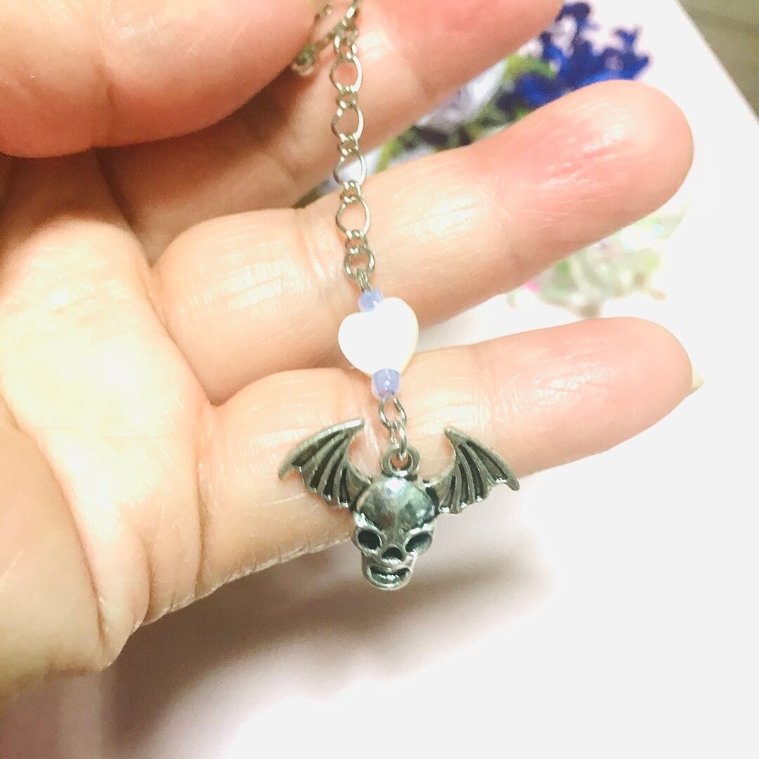 ドクロチャームに天然石マザーオブパールハートを使用してお洒落な仕上がりになりました〜╰(*´︶`*)╯♡