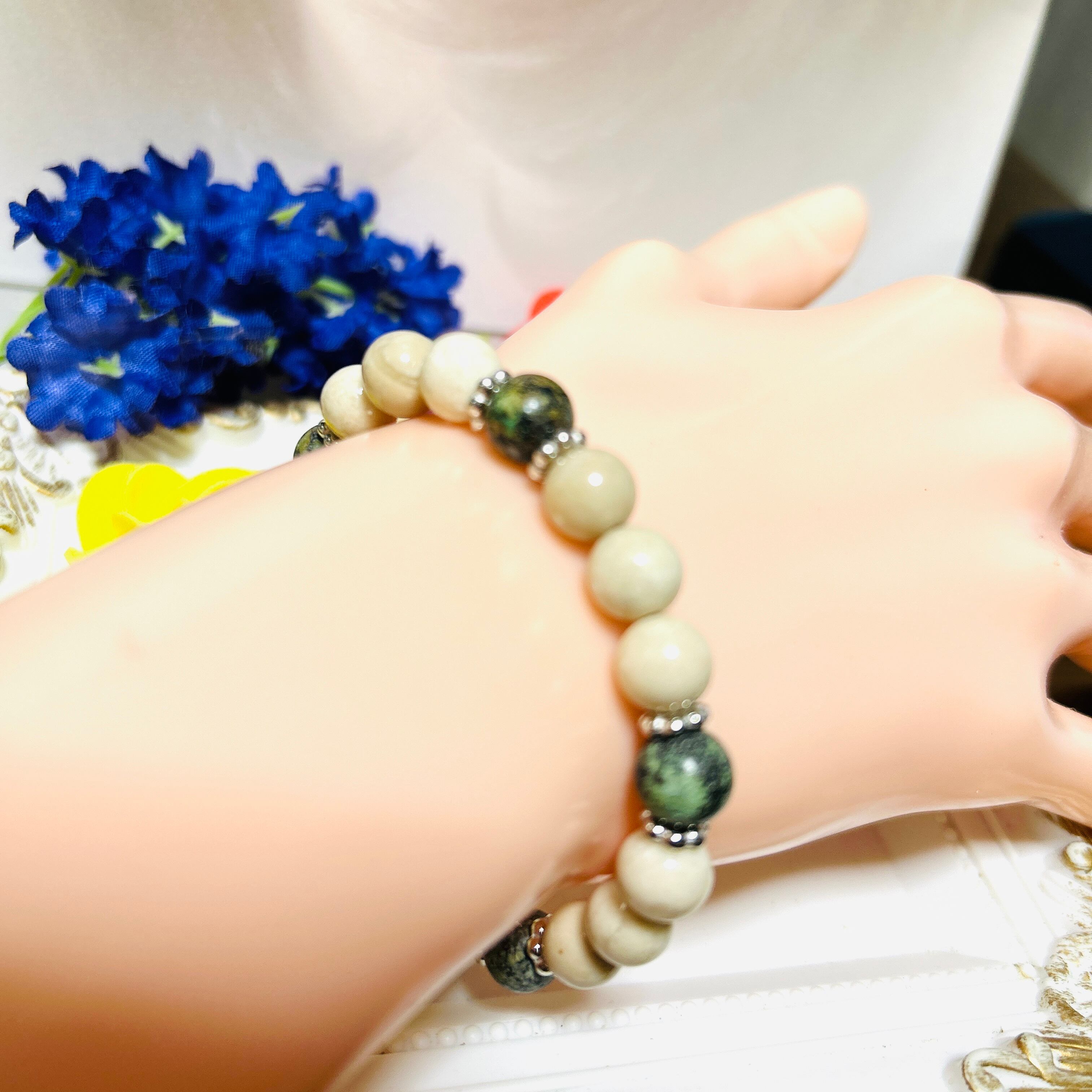 天然石はそれぞれの力をもつと言われており、このブレスレットに使われた石たちにもそれぞれの特性がございます。クリソプレーズは、心を癒してくれるパワーを持ち、ストレスや不安を和らげてくれると言われています。化石色ストーンは、古代生物のエネルギーが宿っているとされ、土地のエネルギーを取り込み、持ち主を助けるともいわれています。