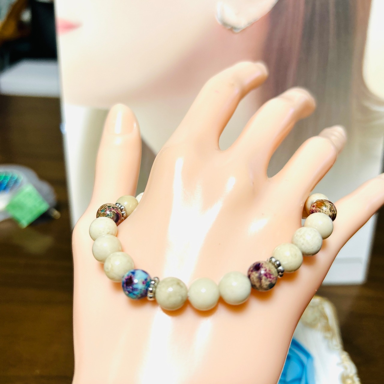 天然石は一点一点異なる色や模様を持ちますので、写真と商品が異なる場合があります。また、ビーズと石の間を隔てる部分はシリコン素材を使用しています。ブレスレットを付けたままの入浴、就寝は避けてください。